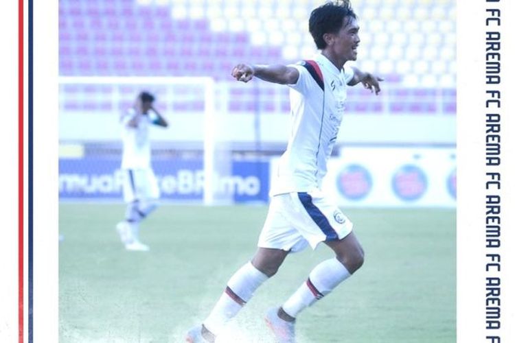 Jayus Hariono merayakan golnya dalam laga Arema Vs Persita pada laga Liga 1 Sabtu 17 Desember 2022. (Foto: Arema FC)