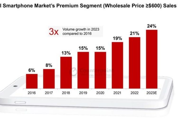 Penjualan ponsel premium telah menunjukkan pertumbuhan yang kuat selama bertahun-tahun. Pada 2016, ponsel jenis ini menyumbang 6% dari total penjualan di seluruh dunia dan akan mencapai 24% pada 2023.