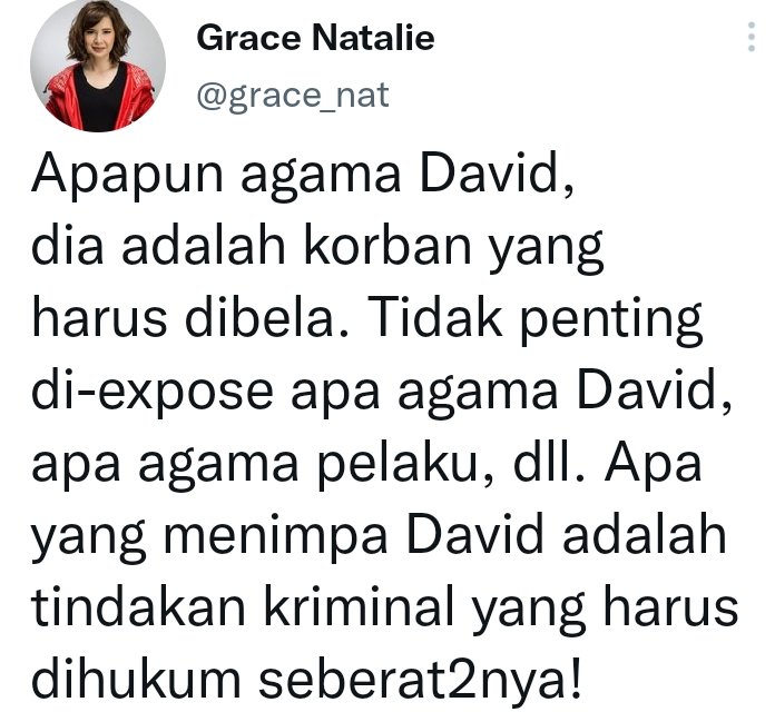 "Apapun agama David, dia adalah korban yang harus dibela. Tidak penting di-expose apa agama David, apa agama pelaku, dan lain-lain Apa yang menimpa David adalah tindakan kriminal yang harus dihukum seberat-beratnya!" tulis Grace di akun @grace_nat yang dikutip Minggu, 26 Februari 2023.