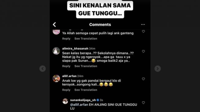 Sunan Kalijaga sebagai ayah Sean tak terima anaknya sedang babak belur justru mendapatkan tudingan seperti itu. Sunan pun melampiaskan emosinya dengan membalas komentar netizen tersebut.