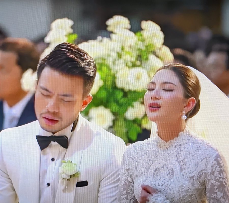Sementara Yakup tampak gagah dalam balutan setelan tuxedo putih. Keduanya bergandengan tangan penuh cinta memasuki aula pernikahan.