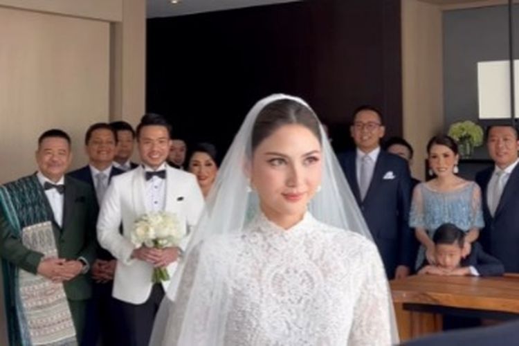 Mila mengenakan gaun pengantin dress brokat menjuntai dilengkapi dengan veil.