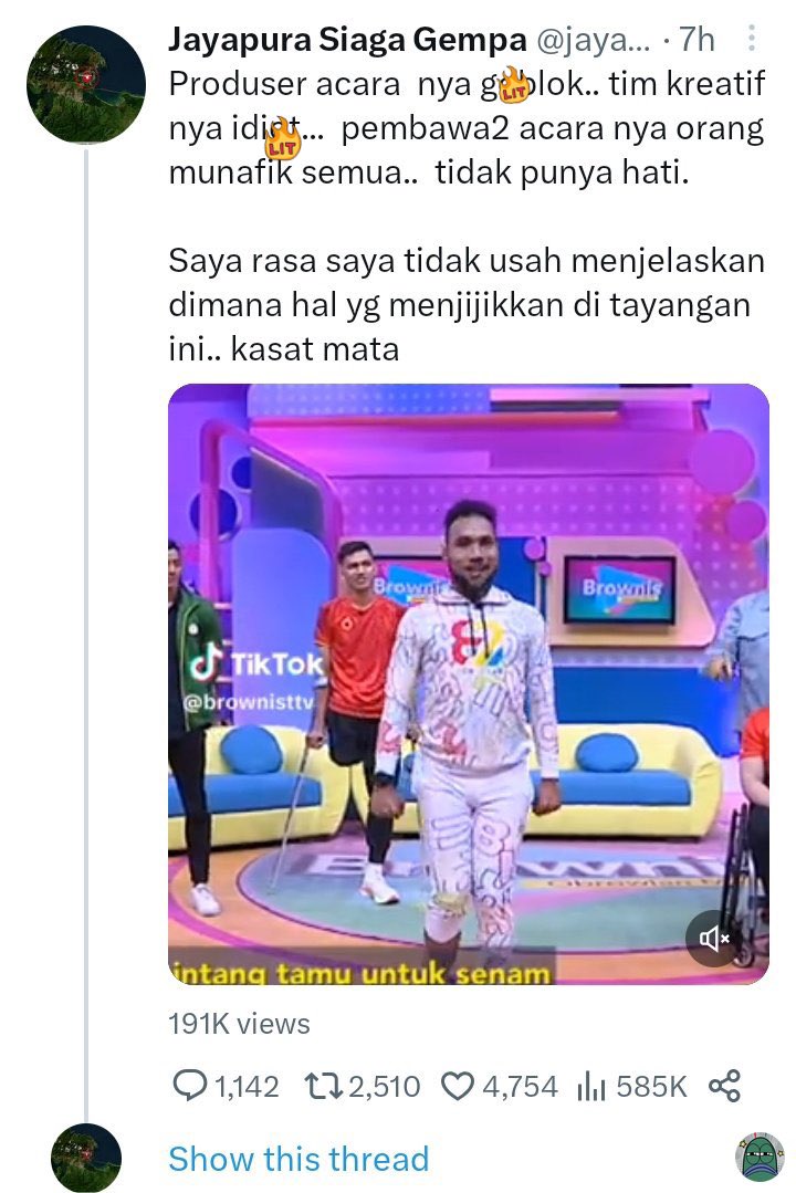 "Dan di stasiun tv nasional mereka nayangin yang kaya gini? Ngajarin senam ke orang yang bahkan gabisa gerak dengan leluasa pakai kakinya. Sebegitu despratenya kah? Apa ngga ada konten lain yang lebih manusiawi untuk naikin rating? Pas liat videonya, ngeliat mereka senyum pas diajarin senam tuh sakit banget," tulis netizen panjang lebar.