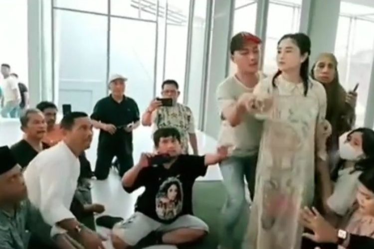 Dewi Perssik yang tak kuasa menahan amarah segera turun dari lantai 2 masjid. Dia terlihat menangis.