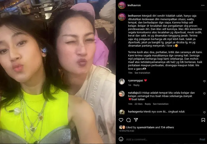 "Karena hidup adalah belajar. Belajar dr kesalahan dan pengalaman sbg proses pendewasaan diri. Dan ikhlas adalah kuncinya," tulis Levi lewat Instagram yang dikutip pada Minggu, 23 Juli 2023.