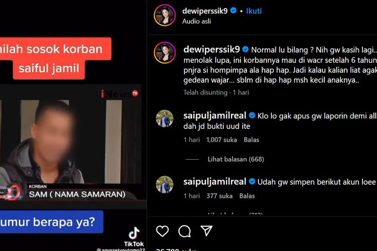 "Klo lo gak apus gw laporin demi allah ini dah jd bukti uud ite," tulis Saipul Jamil di kolom komentar Instagram sang mantan istri.