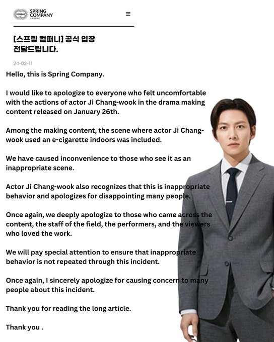 Dalam pernyataan agensi Ji Chang Wook, Spring Company, mereka meminta maaf atas tindakannya yang merokok di dalam ruangan.