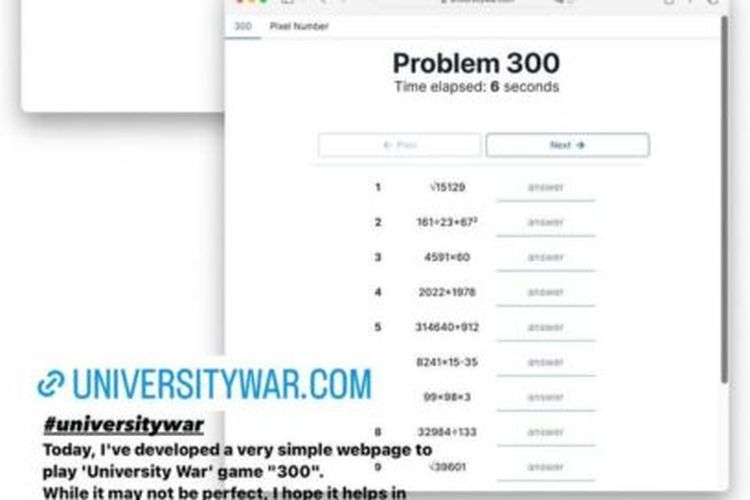 "Hari ini aku mengembangkan sebuah website yang sangat sederhana untuk bermain University War game 300. Meski tidak sempurna, aku berharap ini bisa menyelesaikan 300 soal" tulis Minsub.