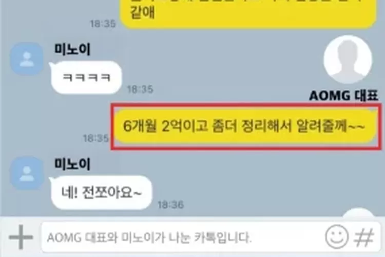 Dalam percakapan tersebut, AOMG mengirimkan kontrak endorsement kepada MEENOI dan memberitahu tentang jumlah kompensasi yang akan ia dapatkan.