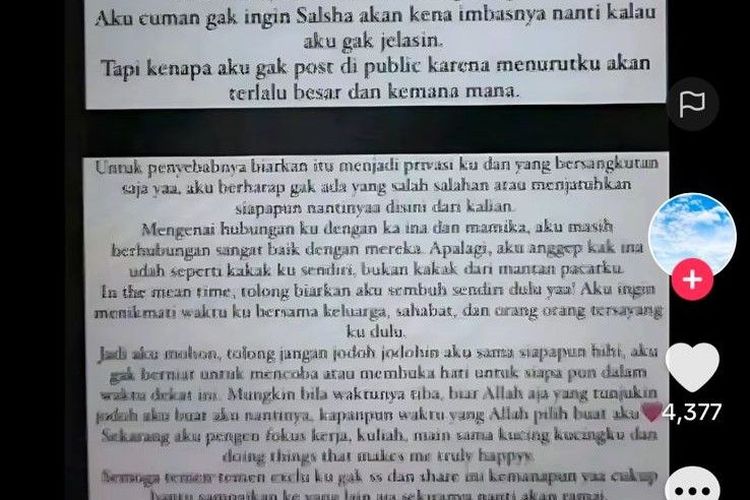 "Untuk penyebabnya biarkan itu menjadi privasi ku dan yang bersangkutan saja ya. aku berharap nggak ada yang salah-salah atau menjatuhkan siapa pun nantinya di sini dari kalian," imbuhnya.