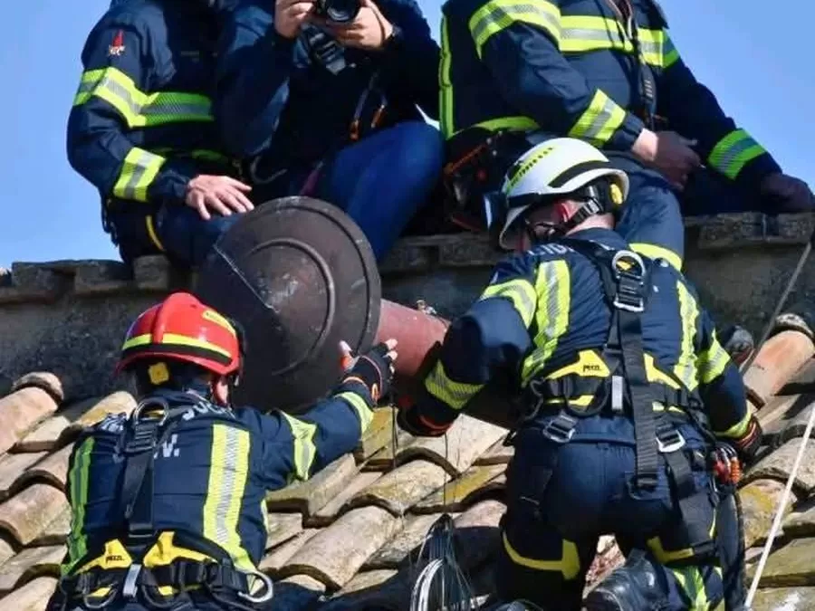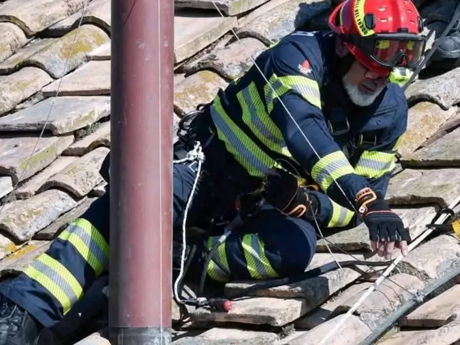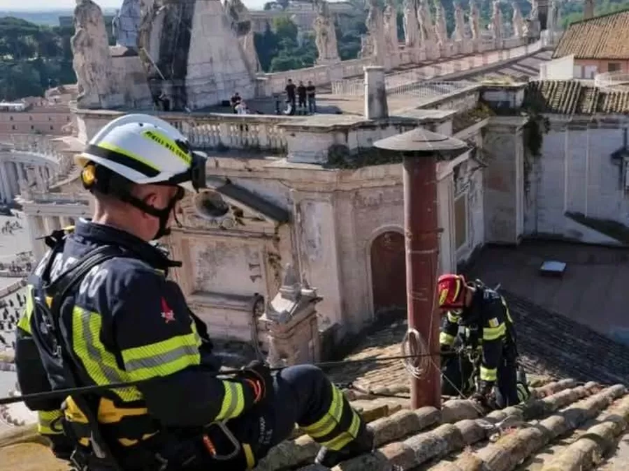 Sejumlah petugas pemadam kebakaran memasang cerobong asap ikonik di atap Kapel Sistina, tempat para kardinal akan berkumpul untuk konklaf atau pemilihan paus baru, di Vatikan, Jumat 2 Mei 2025. Konklaf untuk memilih Paus baru pengganti Paus Fransiskus akan dimulai 7 Mei 2025 yang akan datang. Cerobong asap itu akan menjadi petunjuk, asap hitam = Paus baru belum terpilih, asap putih = Paus baru sudah terpilih.(Foto-foto: AP dan Reuters)