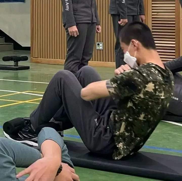 Di foto yang dibagikan, terlihat anggota tertua BTS itu tengah ikut latihan dasar. Jin BS tengah membasuh mukanya dengan dibantu rekan satu divisinya.