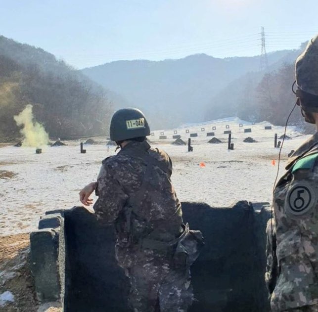 Lalu di foto selanjutnya, terlihat foto Jin BTS melihat ke belakang. Terlihat jin BTS sedang lempar granat ke arah sasaran. Jin BTS lempar granat saat latihan dasar wajib militer.