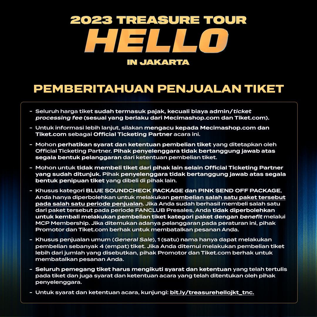 1. Bagi pemegang Fanclube Presale, tiket konser 2023 TREASURE TOUR HELLO In Jakarta dapat dipesan lebih awal yakni pada Senin, 16 Januari 2023 mulai pukul 14.00 WIB sampai 23.59 WIB melalui tiket(dot)com.