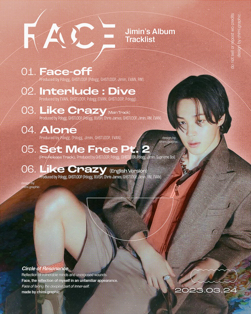 Adapun daftar lagu Jimin terdiri dari "Face-off", "Interlude: Dive", "Like Crazy", "Alone", "Set Me Free Pt 2" dan "Like Crazy English Version".