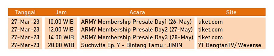 Tiket khusus presale ARMY MEMBERSHIP akan dibuka pada 27 Maret 2023 dengan jadwal ketentuan:
