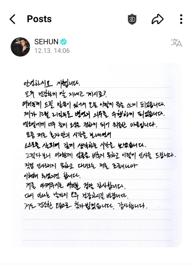 KONTEKS.CO.ID - Sehun membagikan surat tulisan tangan kepada para penggemar di Weverse. Sehun EXO pamit akan wamil. Dia menulis surat yang isinya sangat menyentuh untuk EXO-L.