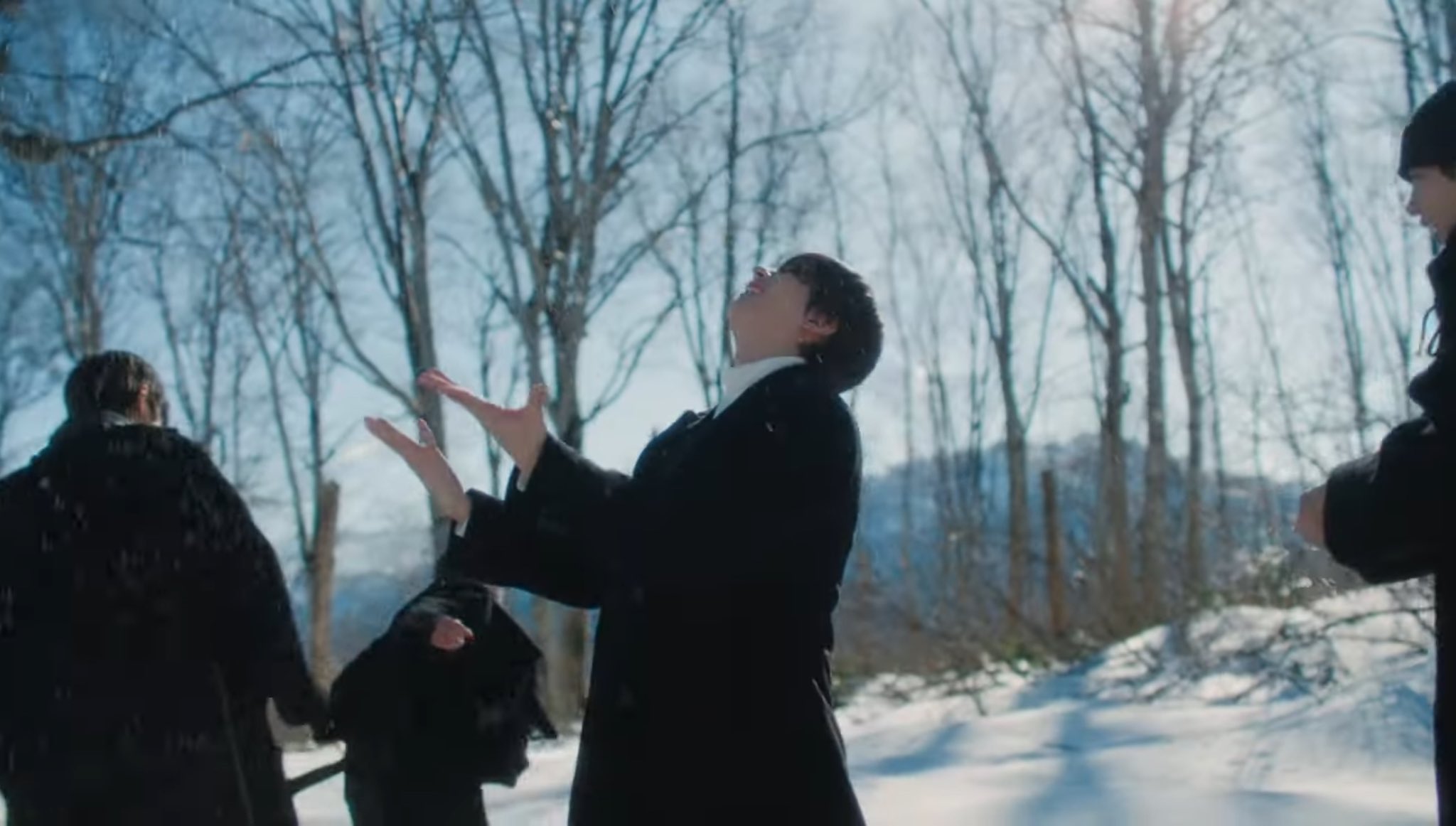 Para anggota menciptakan kenangan di lapangan bersalju, menikmati musim dingin saat mereka bermain salju. Gambar ponsel dan kupu-kupu menambah rasa penasaran.