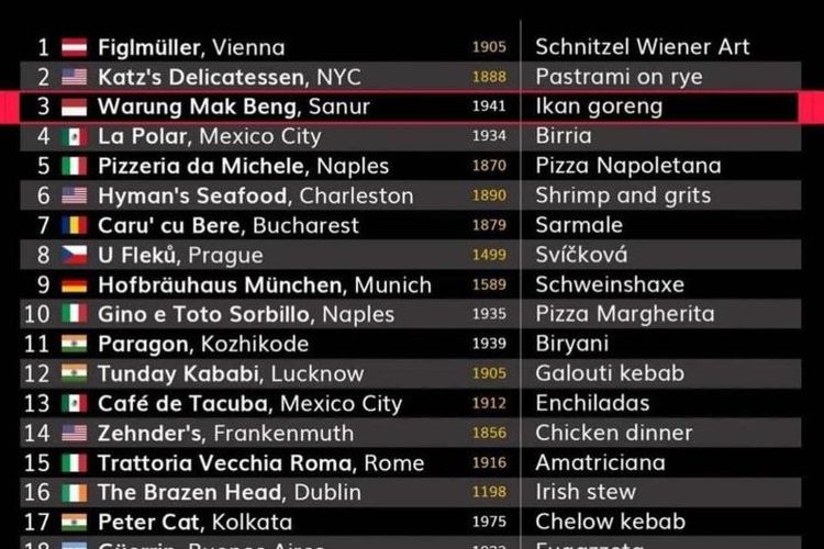 Ada di posisi ketiga, Warung Mak Beng Bali mengalahkan banyak restoran legendaris dunia lainnya. Sebut saja La Polar Mexico City serta Pizzeria da Michele di Napoli, Italia.