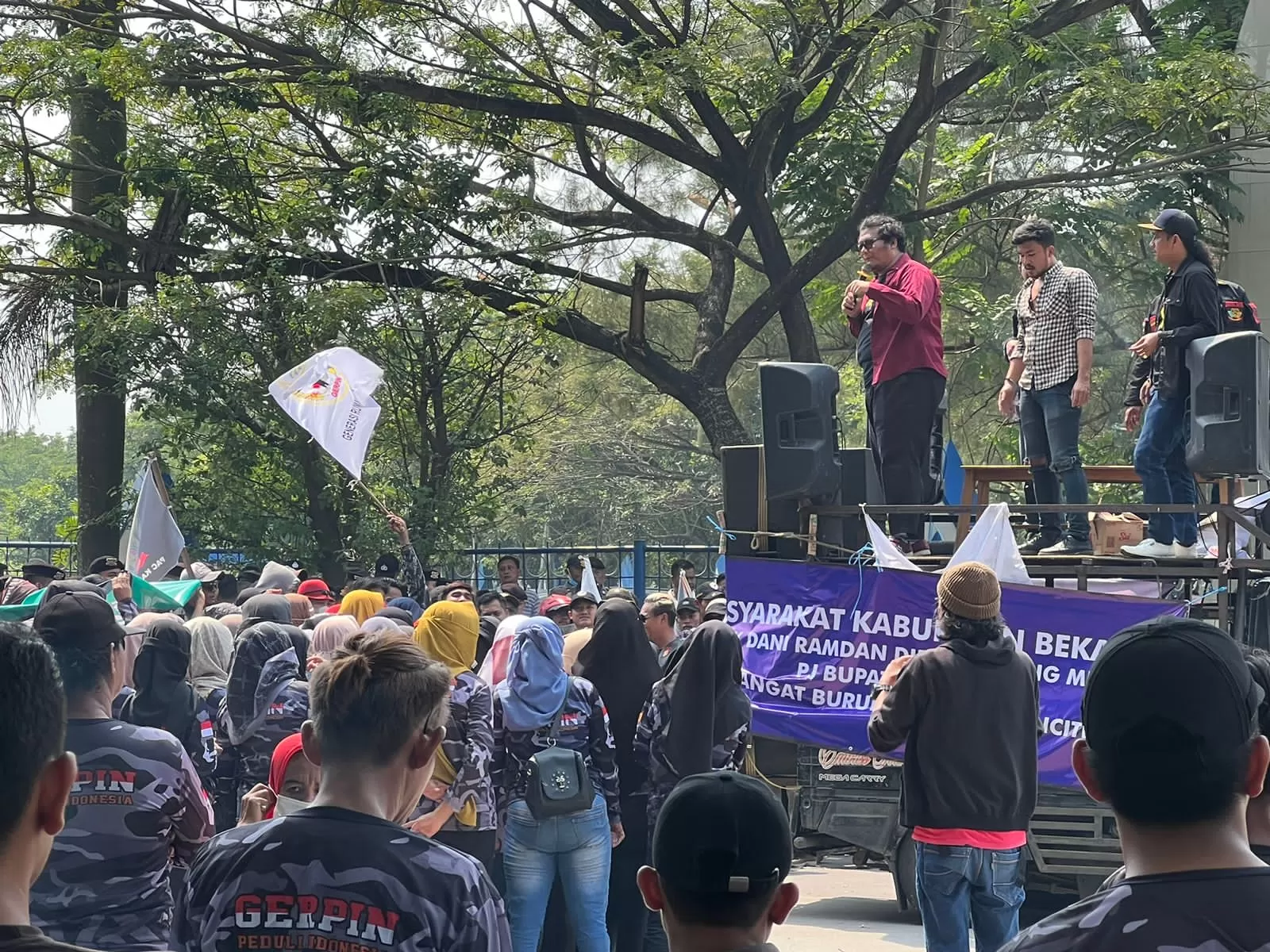 KONTEKS - Seribuan Masyarakat Kabupaten Bekasi dari tiga lembaga melakukan aksi demo di depan Pemkab Bekasi mendesak Pj Bupati Bekasi Dani Ramdan mundur dari jabatannya.
