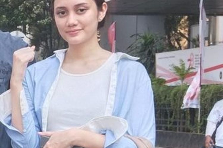 Wanita muda yang mengaku buruh cantik ini kompak mengenakan kemeja biru, bercelana jins dan mengenakan sepatu kets.