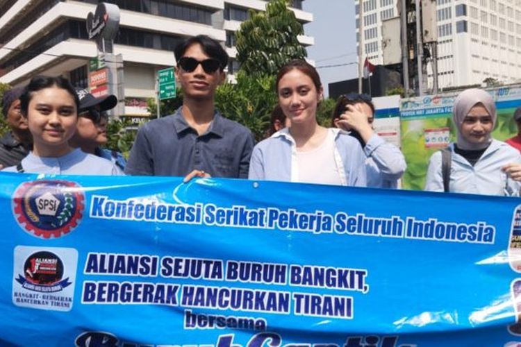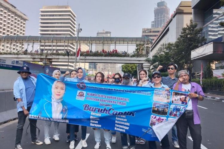 Mereka ikut aksi long march menuju Istana Negara sambil membawa spanduk Konfederasi Serikat Pekerja Seluruh Indonesa dan Aliansi Sejuta Buruh Bangkit, Bergerak Hancurkan Tirani bersama Buruh Cantik.