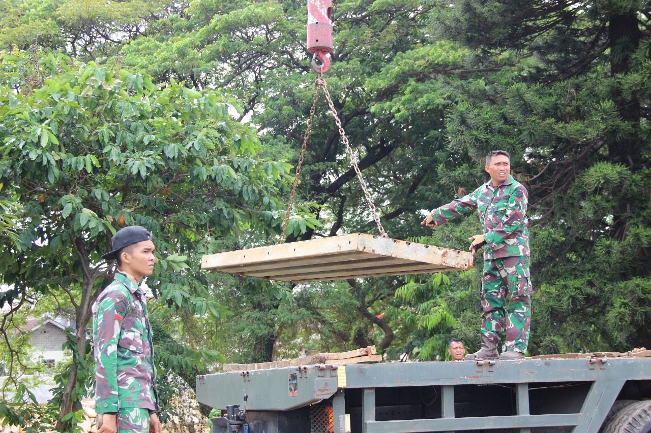Danrem 051/Wijayakarta Brigjen TNI Nugroho Imam Santoso, turun langsung untuk memantau pembangunan jembatan yang ambles di Perumahan Kemang Pratama, Bekasi.