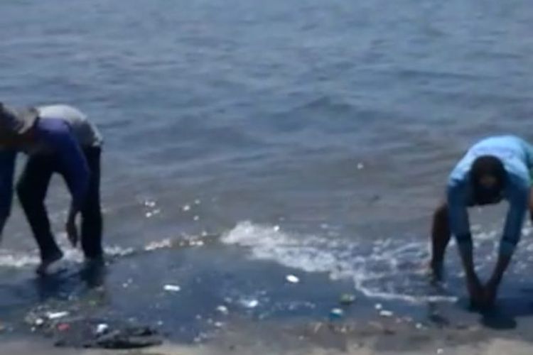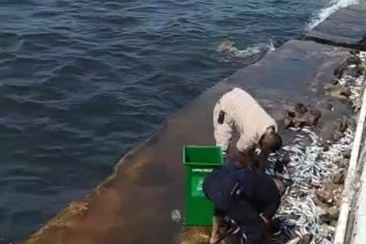 Dalam video yang diterima Konteks.co.id, nampak ribuan ikan menggelepar di bibir pantai. Bahkan, ada yang naik ke tembok pembatas air di pinggir pantai.