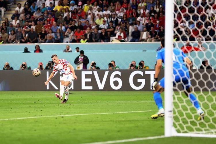 Mislav Orsic melepaskan tendangan placing yang tak dapat dijangkau kiper Maroko pada duel perebutan tempat ketiga Piala Dunia 2022. (Foto: FIFA)