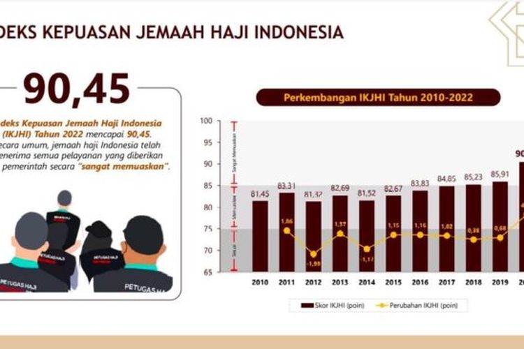 KONTEKS.CO.ID - Badan Pusat Statistik (BPS) sudah merilis hasil survei indeks kepuasan jemaah haji (IKJH) 1443 H/2022. Hasilnya, indeks kepuasan jemaah haji Indonesia mencapai 90,45 atau masuk kategori sangat memuaskan.
