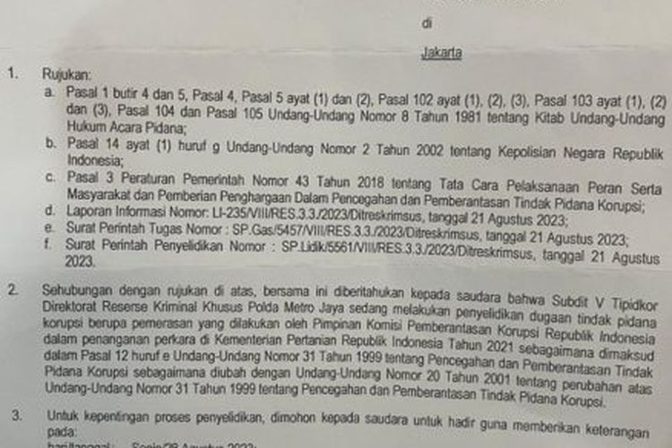 Surat panggilan yang beredar tersebut bernomor B/10338/VIII/RES.3.3/2023/Ditreskrimsus. Pemanggilan terkait dengan permintaan keterangan dan dokumen. Dikirimkan pada 25 Agustus 2023.