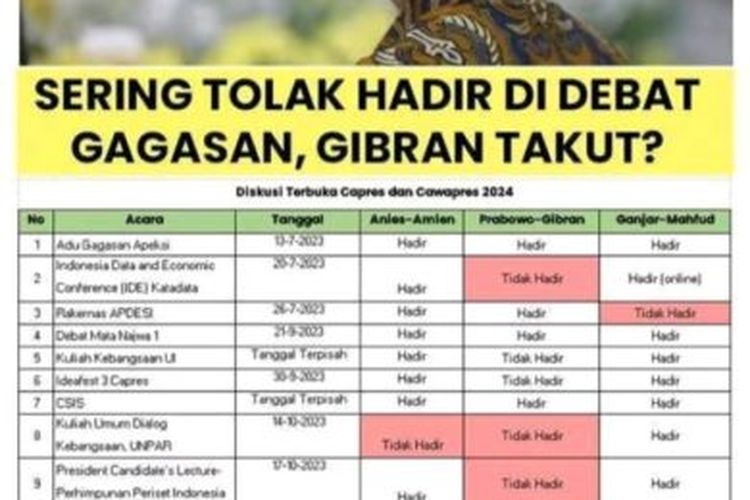 Lalu pasangan Prabowo-Gibran tidak bisa hadir di diskusi terbuka bersama Indonesia Data and Economic Conference (IDE) Katadata, Kuliah Kebangsaan UI, Ideafest 3 Capres, Kuliah Umum Dialoh Kebangsaan UNPAR, President Candidate’s Lecture-Perhimpuan Periset Indonesia.