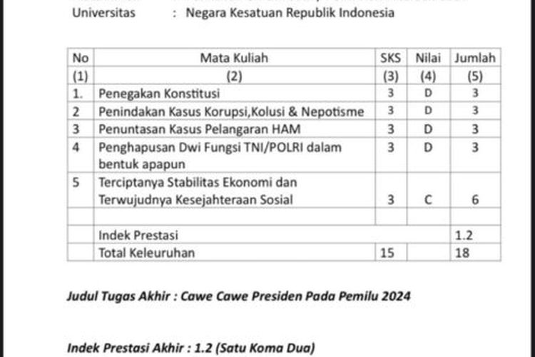 Selain itu menurut Bayu, dengan mendapat nilai 1,2 saja, prestasi Jokowi ‘Sangat Tidak Terpuji’ saat yudisium.