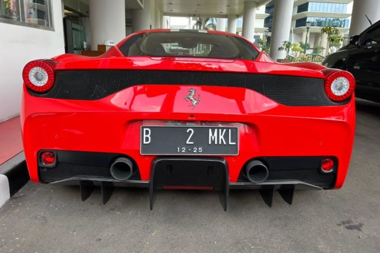 Dua mobil Ferrari yang disita berwana merah. Ferrari 458 Speciale B 1985 SHM dan Ferrari Challenge Stradale B 2 MKL.