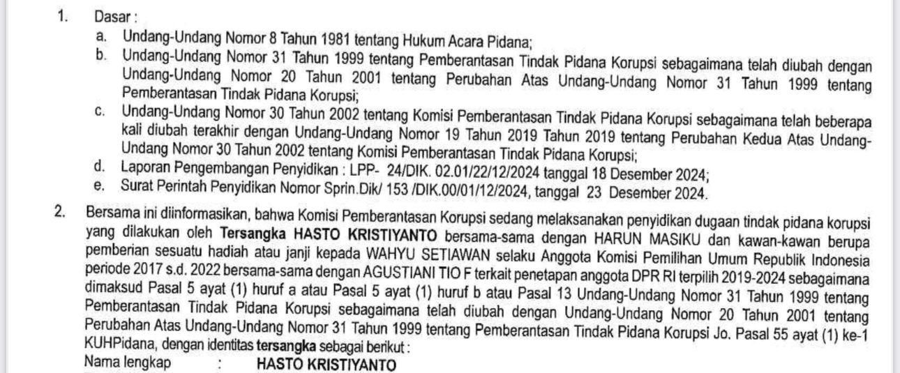 Penyebutan nama Hasto Kristiyanto sebagai tersangka tercantum dalam surat pemberitahuan dimulainya penyidikan (SPDP). Mengutip Detikcom, surat perintah penyidikan atau sprindik penetapan tersangka Hasto adalah Sprin.Dik/153/DIK.00/01/12/2024 tanggal 23 Desember 2024.