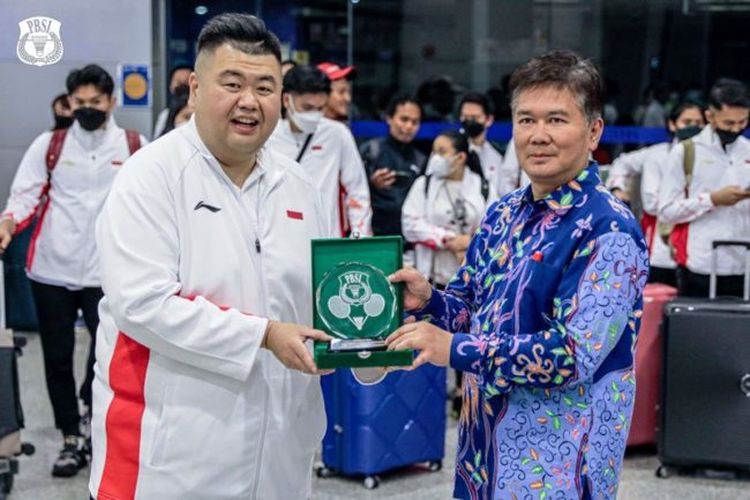 Manajer tim bulutangkis Indonesia ke Piala Sudirman 2023, Armand Darmadji, disambut Konsul Jenderal Indonesia setibanya di Shanghai. (Foto: PBSI)