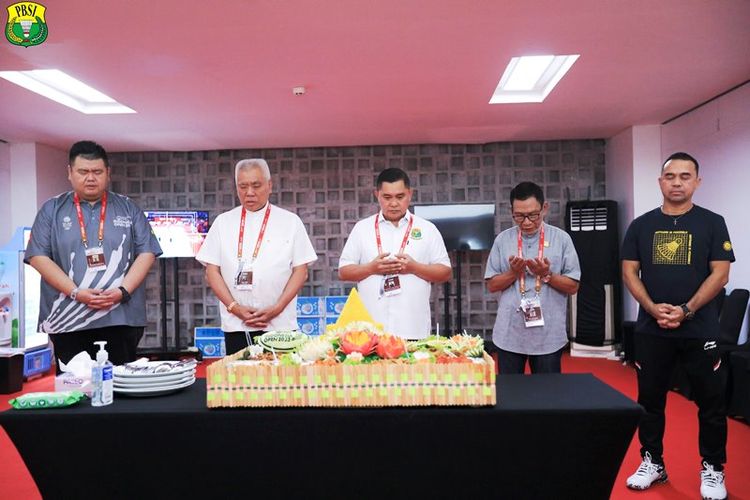 Didampingi Ketua Harian PP PBSI Alex Tirta dan Wakil Sekretaris Jenderal PBSI Edi Sukarno, potongan tumpeng diberikan Fadil kepada Ketua Panitia Penyelenggara Armand Darmadji dan Kepala Bidang Pembinaan dan Prestasi PP PBSI Rionny Mainaky.