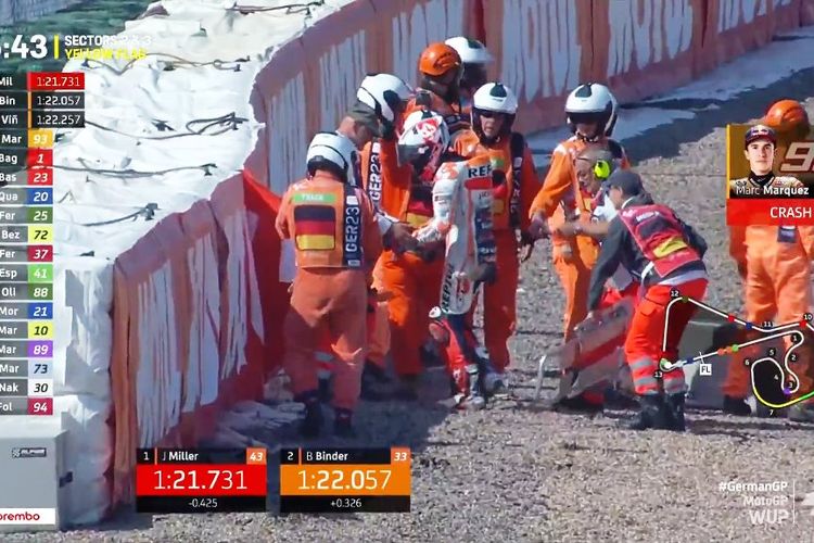 Namun, setelah mengalami pukulan keras di Tikungan 7 pada sesi pemanasan Minggu pagi waktu setempat, juara 11 kali di Sachsenring itu mengalami patah tulang kecil di ibu jari kirinya.